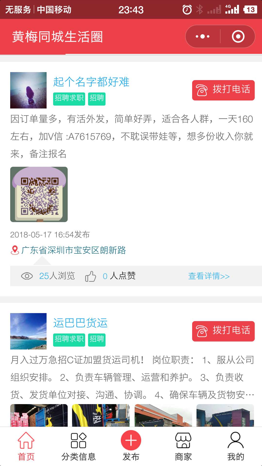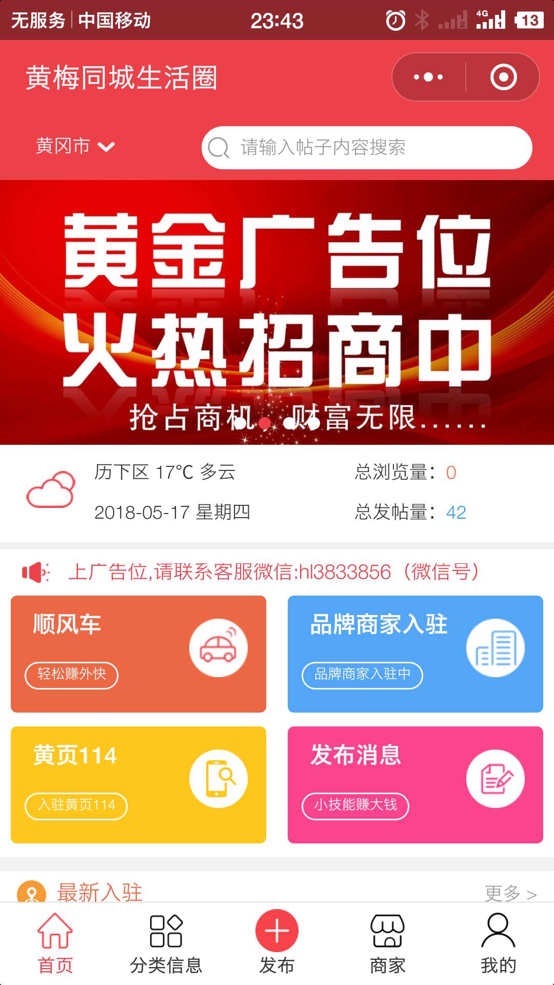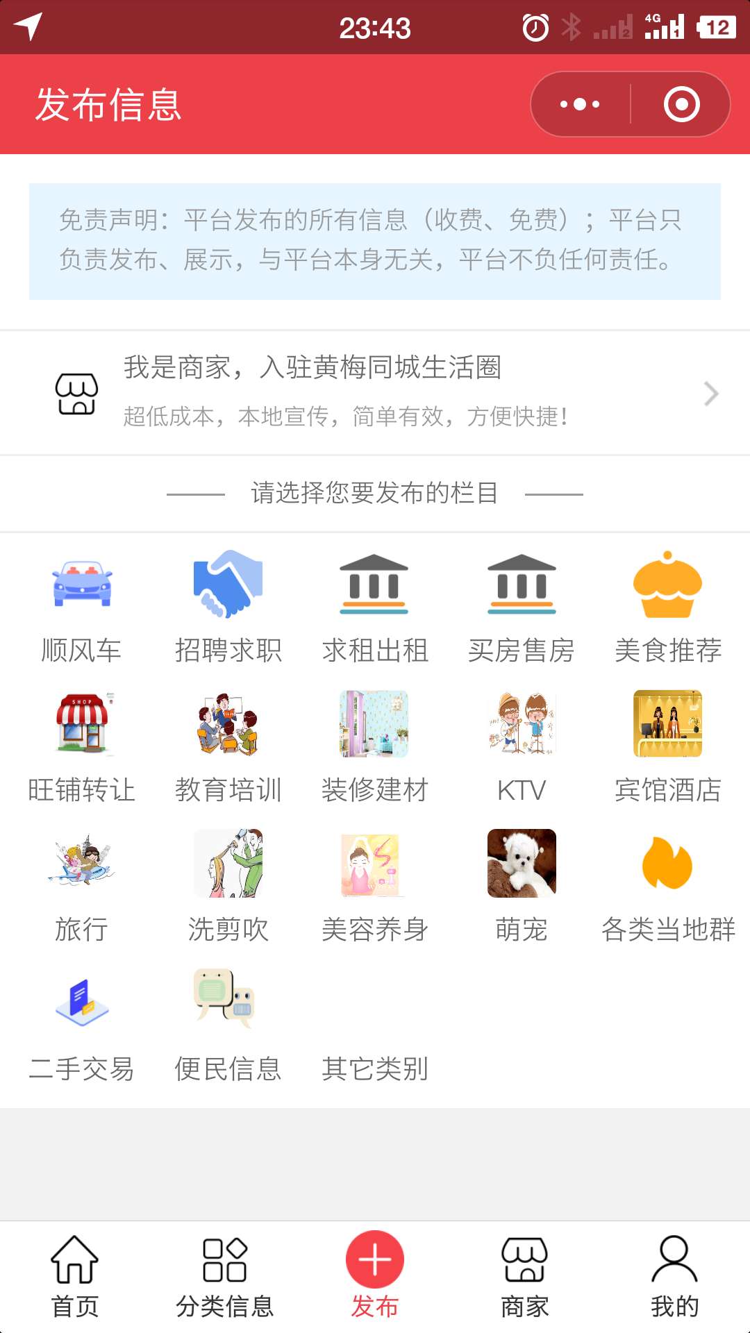 黄梅同城微信小程序的内容包括由用户即时发布的房产、汽车、招聘求职、物品租售、生活服务、商务服务、培训教育、二手交易、征婚交友、校园生活、社区活动等分类信息、以及城市生活服务的各类商家信息。
